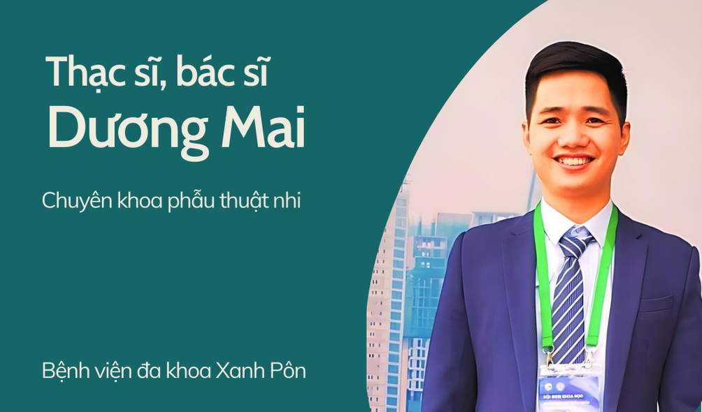 Bác sĩ Dương Mai Công tác tại khoa Phẫu thuật nhi – bệnh viện đa khoa Xanh Pôn SĐT: 0968.193.566 Kinh nghiệm và thành tích nổi bật Có kinh nghiệm gần 10 năm trong chuyên ngành Phẫu thuật nhi: Thoát vị bẹn, ẩn tinh hoàn, hẹp bao quy đầu, lún dương vật, nang niệu rốn,…